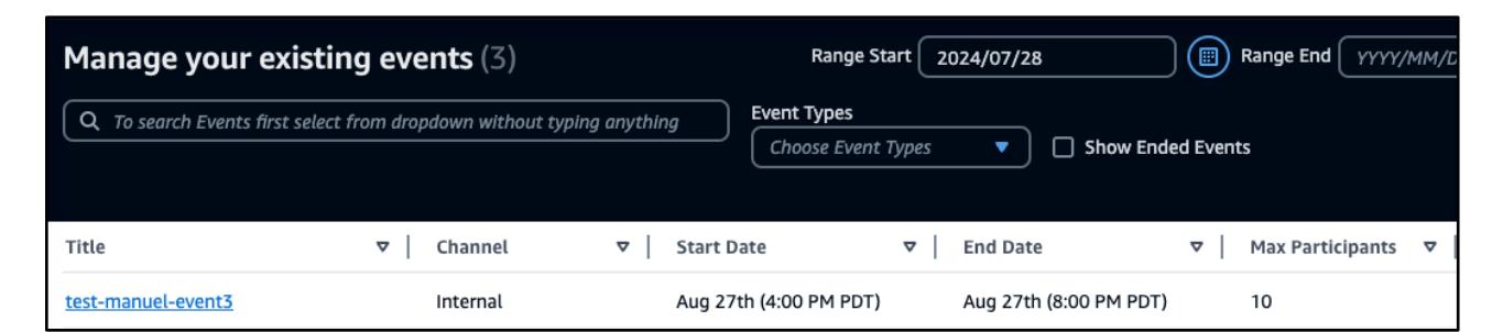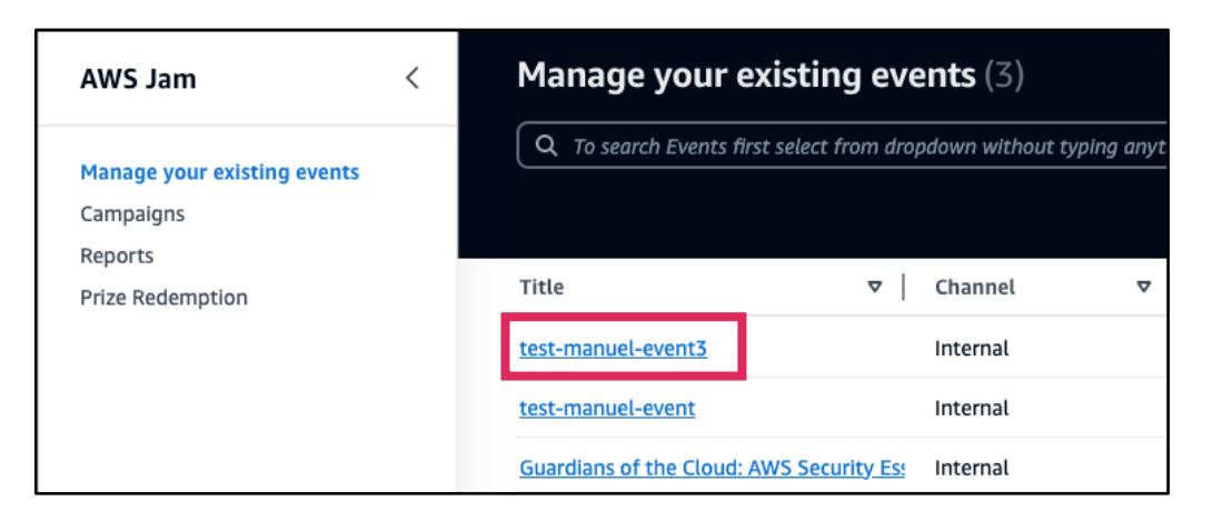 - 既存のイベントの一覧ページには、各イベントの名前が表示されます。アクセスしたいイベントタイトルを選択します。
