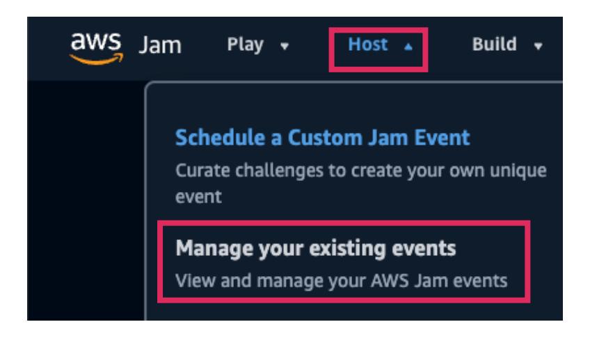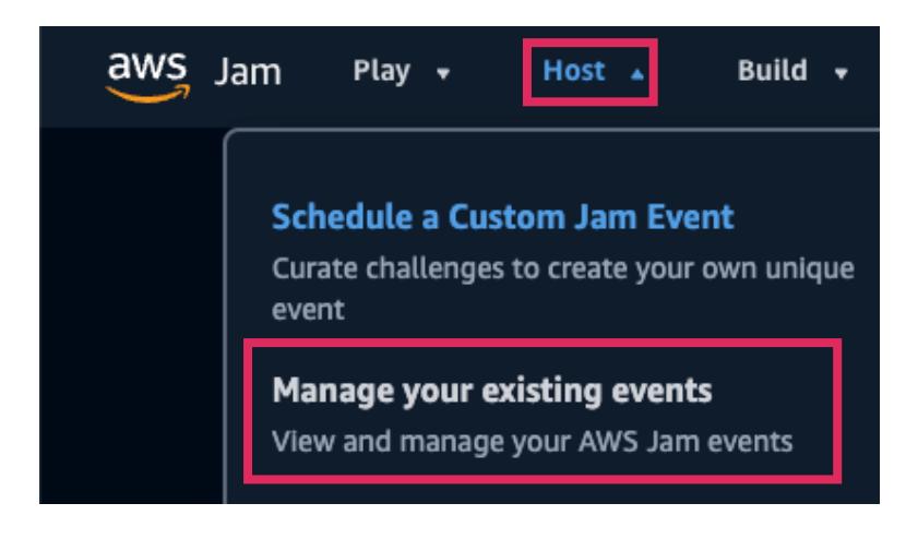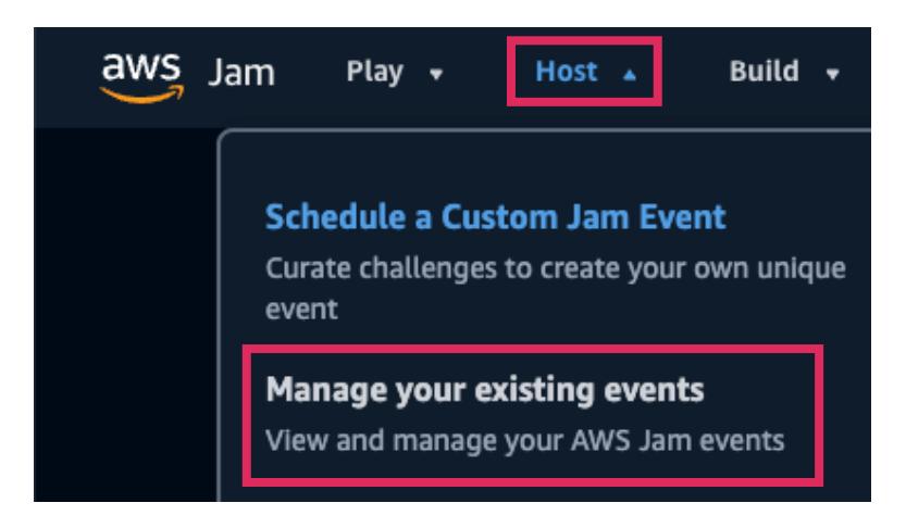 - Jamランディングページのナビゲーションで、Hostを選択し、次にManage your existing eventsを選択します。
