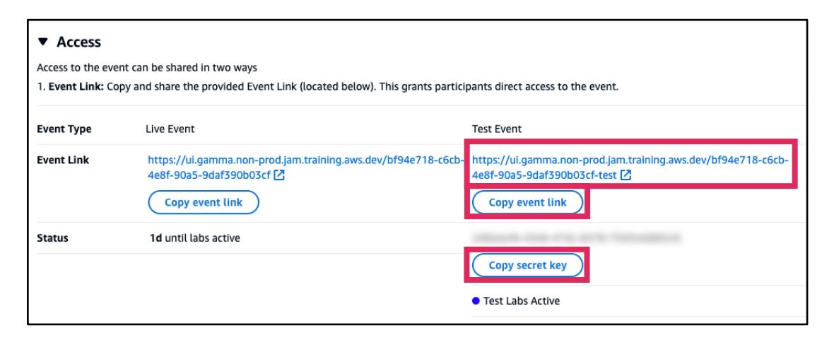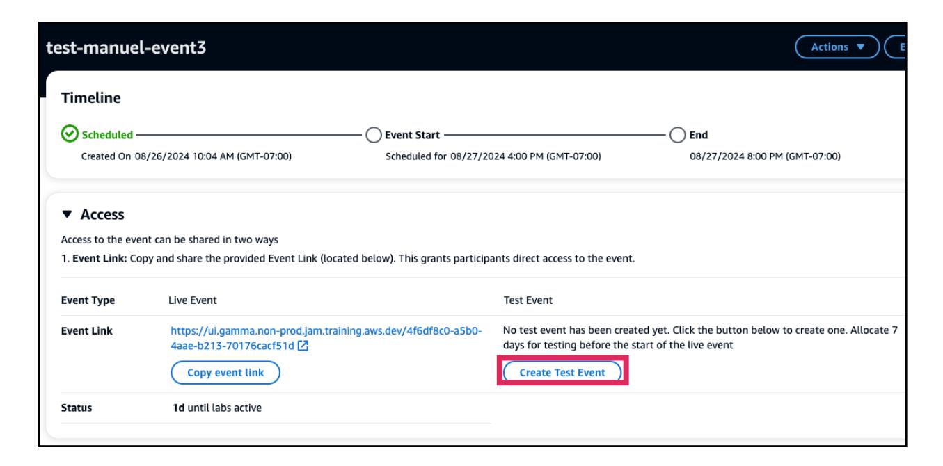 - Accessパネルに移動してテストイベントリンクを確認します。Event Linkには、Test Eventのイベントリンクが表示されます。リンクがない場合は、Create Test Eventを選択します。