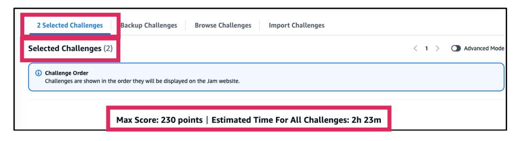 - Selected ChallengesタブとSelected Challengesページには、その横に選択されたチャレンジの総数が表示されます。Max scoreポイントと、Estimated Time For All Challengesでイベントにかかる推定時間を確認できます。