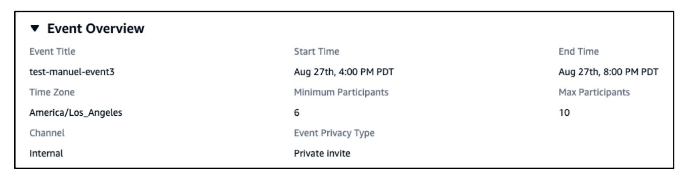 - イベント概要パネルには、タイトル、開始および終了時間、参加者数、チャンネル、プライバシータイプなどのイベントの詳細が表示されます。