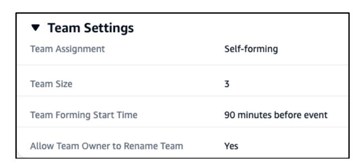- チーム設定パネルには、チーム割り当て、サイズ、形成開始時間、チーム名変更機能に関する情報が表示されます。