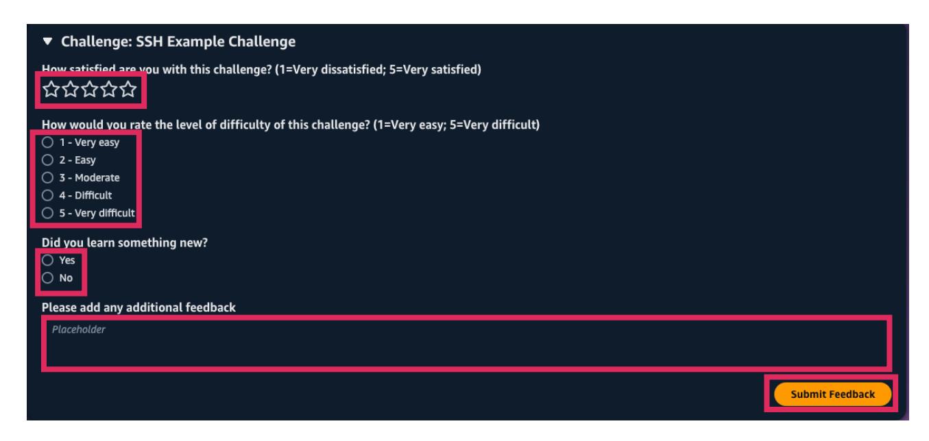 - For entering challenge feedback choose a number of stars, a number, or yes or no. Type additional feedback in the please add any additional feedback field. When done, choose Submit Feedback.