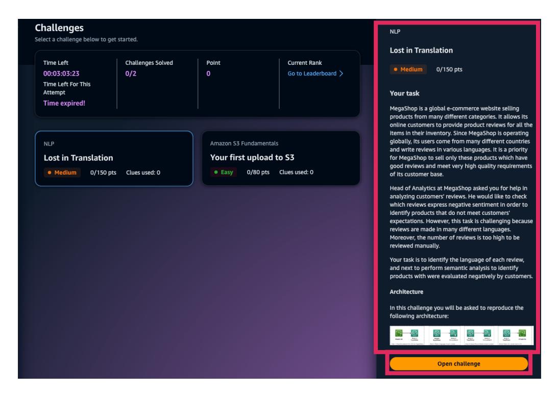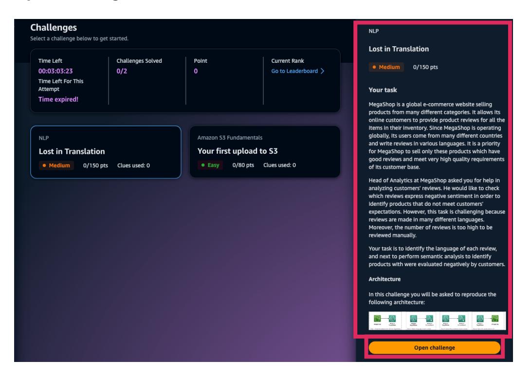- The challenge description panel shows on the right side. Choose Open challenge.