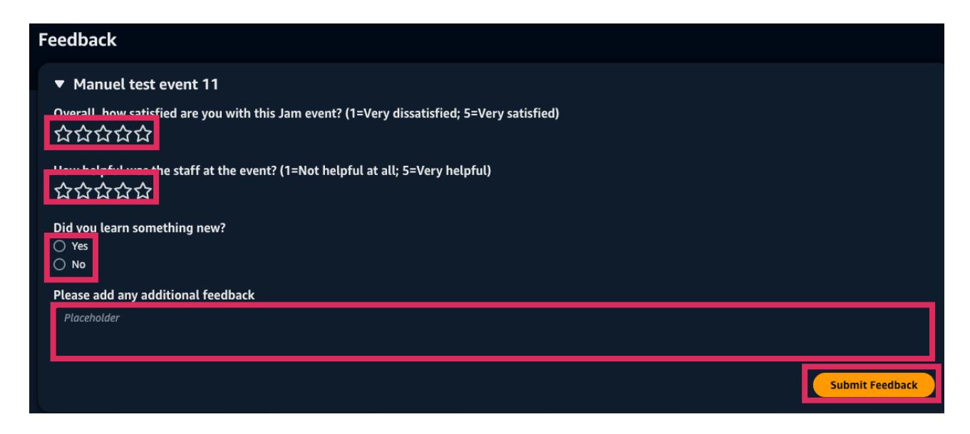 - To submit event feedback choose a number of stars, or yes or no. Type additional feedback in the please add any additional feedback field. When done, choose Submit Feedback.