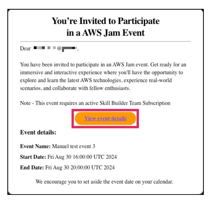 - Check your email inbox for an email titled "AWS Jam – Invitation". It will contain the event details. Open the email and choose View event details. > 📝 Note: Read the email carefully for any important notes.