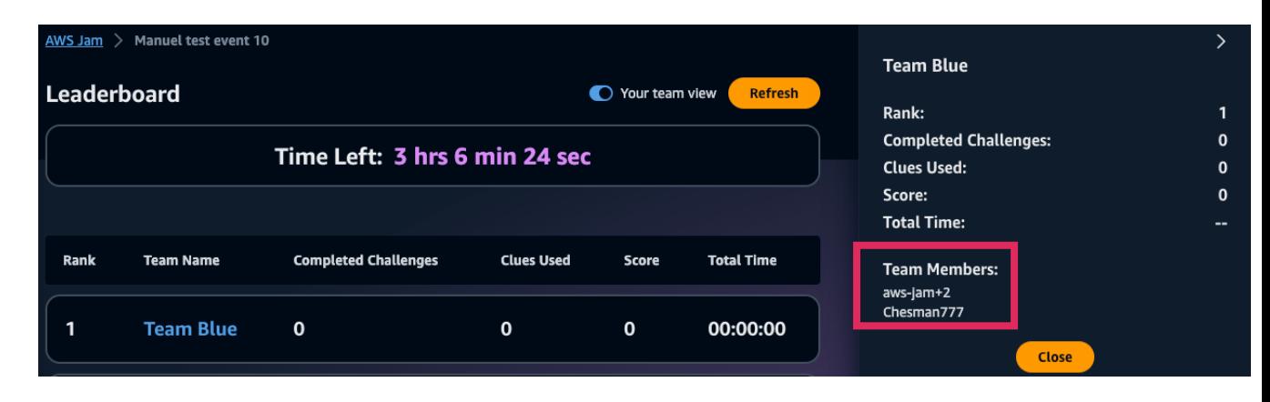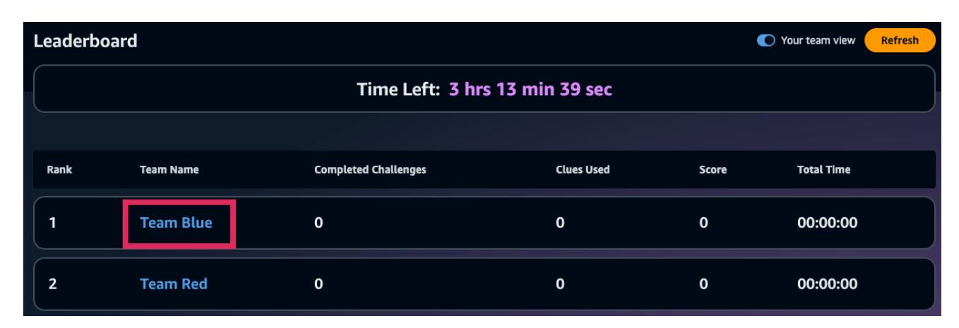- The leaderboard shows how much time is left for the challenges, team rankings and team statistics. Choose a team name to see its team members