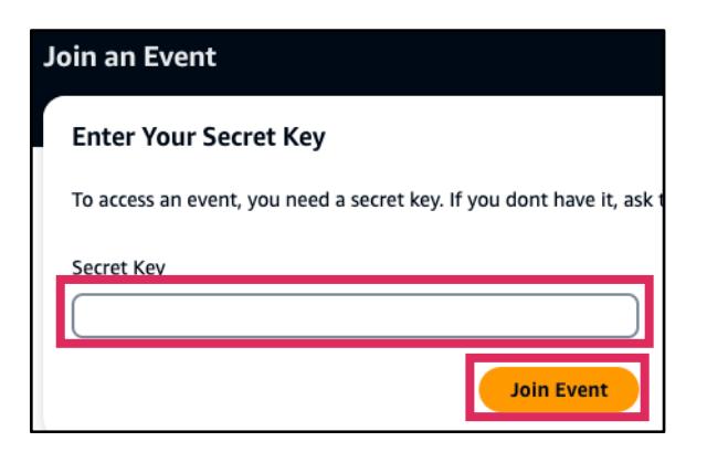⚠️ IMPORTANT: You must have the secret key to enter the event. If you don't have it ask the event owner to send it to you.