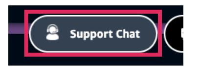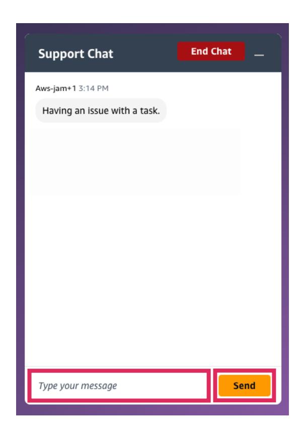 - The support chat window displays on the bottom right of the page. Type your message in the Type your message field and then Send.