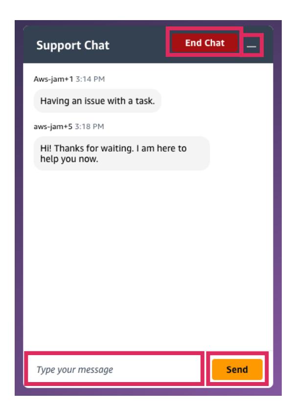 - A support team member will respond to your request and you can read their response in the support chat window. Type your message and send as many times as needed. Choose minimize to hide the Support Chat window. When done conversing, choose End Chat.