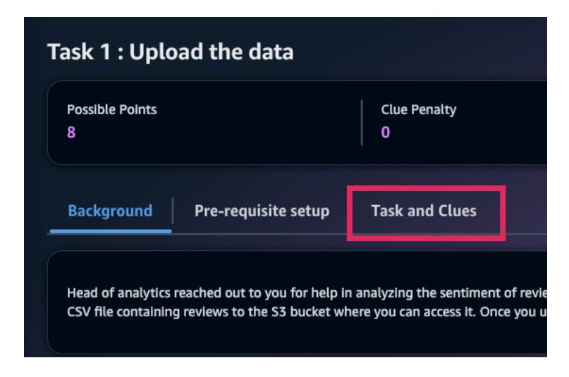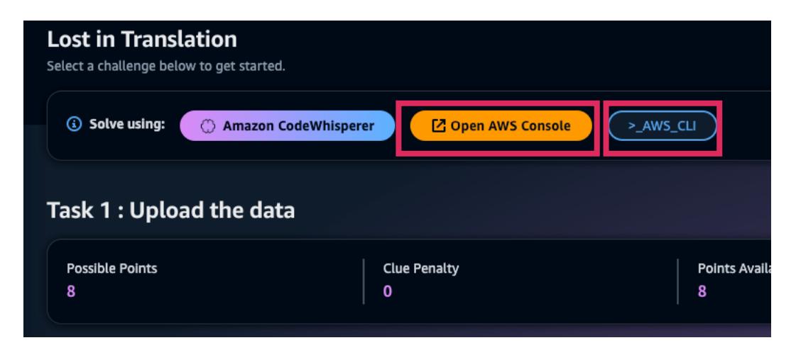 - The task page shows the name, possible points, clue penalty, and points available. You earn points by solving and task. Choose Open AWS Console or AWS_CLI.