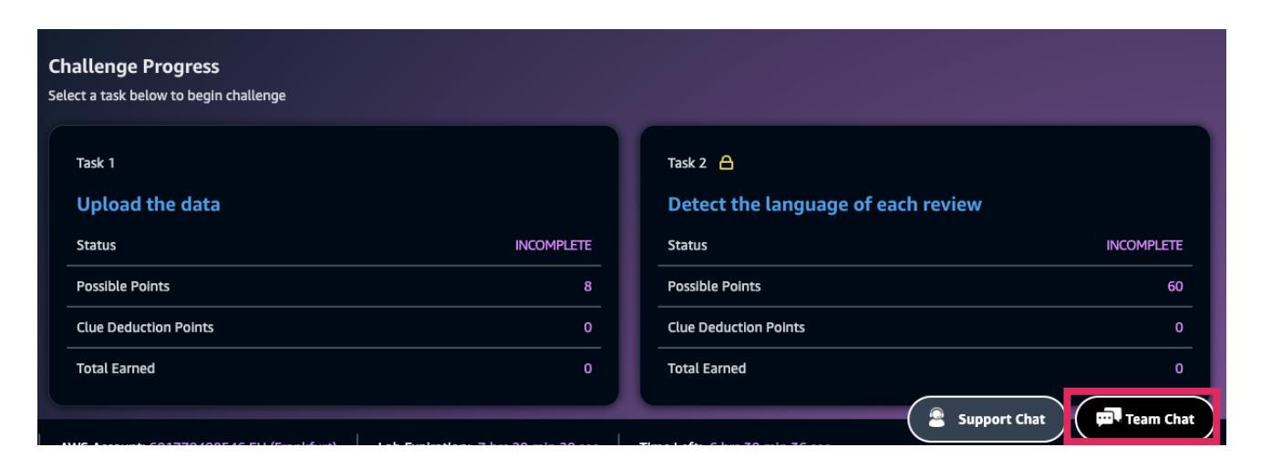 - In the challenge page, choose Team Chat, on the bottom right of the page.