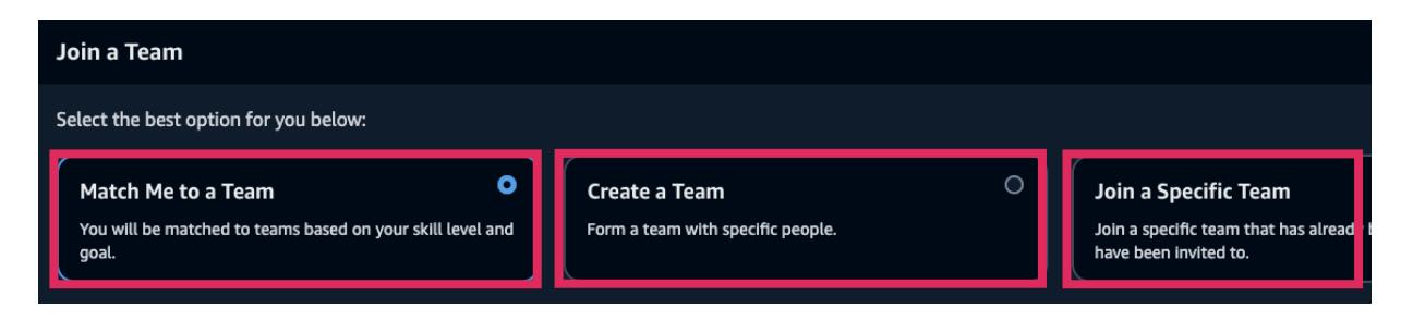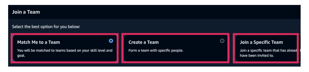 - You will enter the event and be asked to join a team. Choose one of the following options: